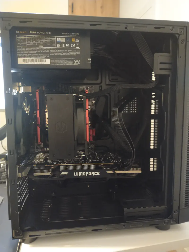 Do poprawnego działania każdego urządzenia elektronicznego jest wymagane zasilanie. W tym celu wybrałem zasilacz z certyfikatem 80 plus gold o mocy 650W od BeQuiet!. Zdecydowałem się na zasilacz modularny, tak aby żaden zbędny kabel nie zajmował przestrzeni w obudowie. Odpowiedni zapas mocy zapobiega nagrzewaniu się komponentów. Mimo to uważam teraz, że zapasu mocy jest aż nadto.