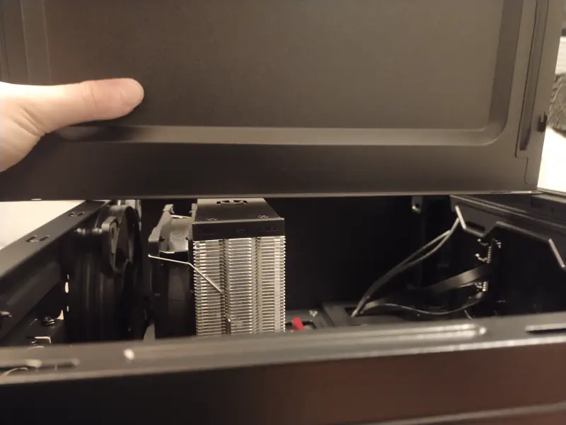Muszę przyznać, że byłem świadomy wymiarów radiatora chłodzenia jak i ograniczeń co do samej obudowy, natomiast bardzo się zaskoczyłem jak bardzo będzie to wyliczone. Na poniższym zdjęciu poprzez przyłożenie jednej z krawędzi panelu bocznego do obudowy pokazuję jak nie wiele miejsca zostaje od krawędzi wnętrza obudowy do samego szczytu radiatora.