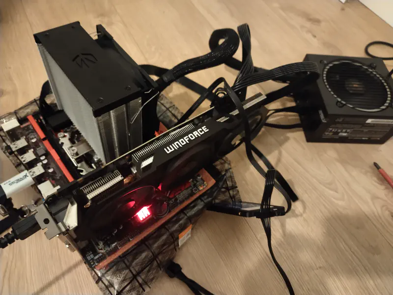 Ponieważ CPU nie posiada zintegrowanej karty graficznej, byłem zmuszony do zakupienia dedykowanej karty GPU z lokalnego portalu aukcyjnego. Wybór padł na nVidia GeForce GTX 970. Karta ta miała premierę w okolicach roku 2014, a tekst piszę w 2023 roku. Zamiast premierowej ceny 1429 PLN, wymieniłem 370 PLN na ten kawałek PCB. W trakcie dokonywania zakupu kierowałem się chęcią pogrania w starsze tytuły, takie jak chociażby Tom Clancys: Rainbow Six Siege, a także zasmakowania początków z machine learning. Uważam wybór za poprawny, biorąc pod uwagę kwotę, jaką przyszło mi zapłacić.