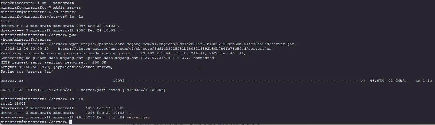 Na stronie minecraft.net znajduje się link do najnowszej wersji, w moim przypadku na moment pisanie tego posta jest to wersja 1.20.4. Skopiowałem link prowadzący bezpośrednio do wybranego przeze mnie pliku i za pomocą wget zapisuje plik do mojego katalogu server. Fakt, że plik zapisze mi się w wybranym przeze mnie katalogu wynika z tego, że w kroku poprzednim przeszedłem do wybranego miejsca docelowego poleceniem cd.