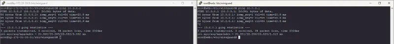 Po uruchomieniu interfejsów sieciowych WG powyższym poleceniem na obu maszynach powinna być możliwa komunikacja obustronna, ze strony serwera wykonanie polecenia ping 10.0.0.2, powinno poskutkować uzyskaniem odpowiedzi od interfejsu wg0 z maszyny Host, a także wykonanie polecenia ping 10.0.0.1 na maszynie Host, powinno skutkować odpowiedzią od interfejsu wg0 z serwera.